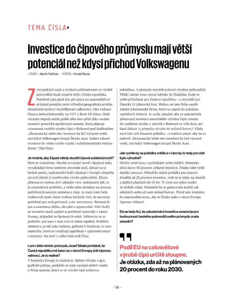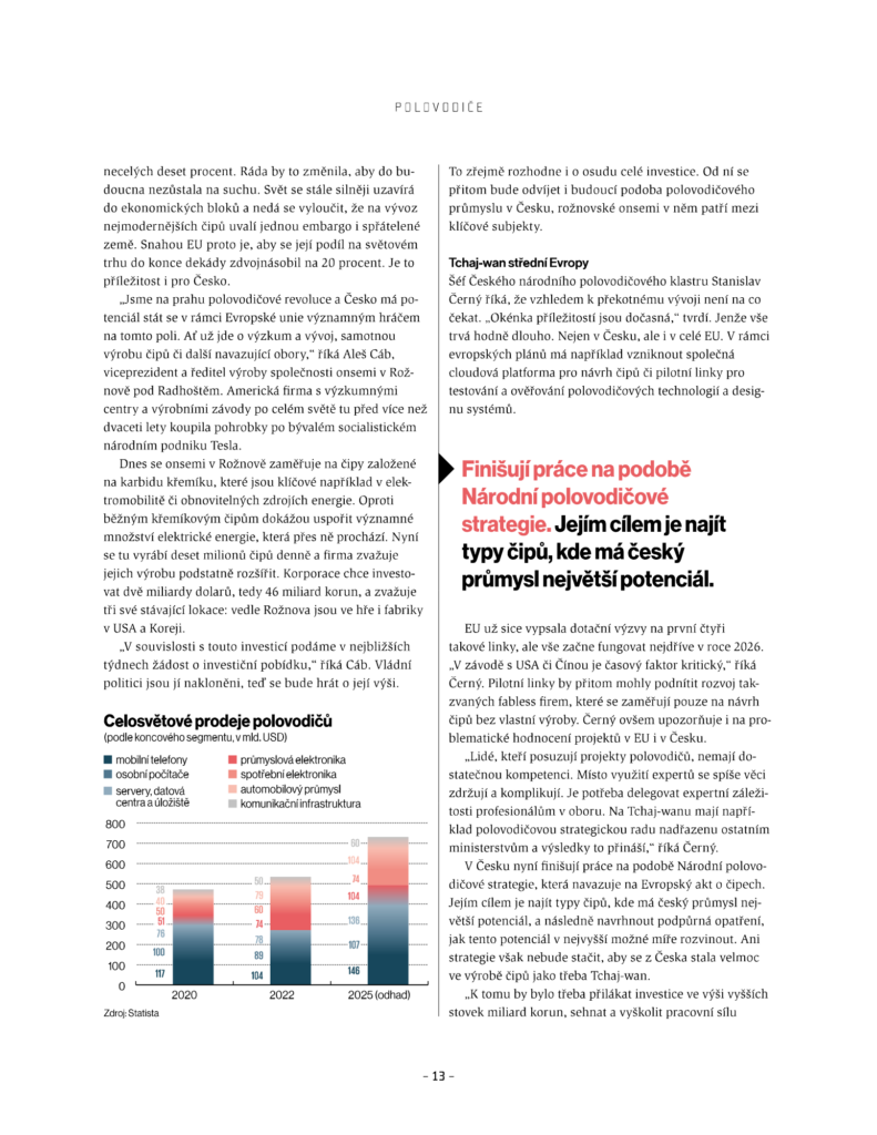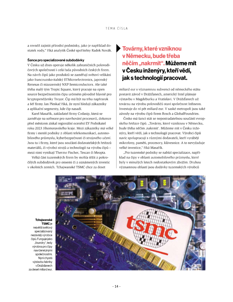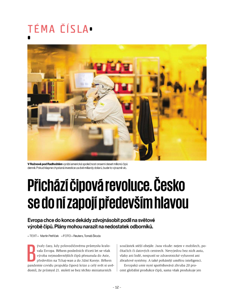 Nemohli jsme chybět v týdeníku Ekonom s tématem Čipová velmoc Česko. Zaměřuje se totiž na budoucnost českého polovodičového průmyslu. Dozvíte se spoustu zajímavých informací o přicházející čipové revoluci, roli České republiky i české onsemi.